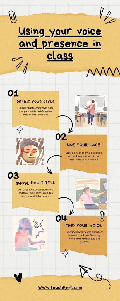 Obviously, your voice is one of your main tools and what you say in class (and what you donโt say!) is very important. Here, however, we are going to talk about how you can use your voice so that: